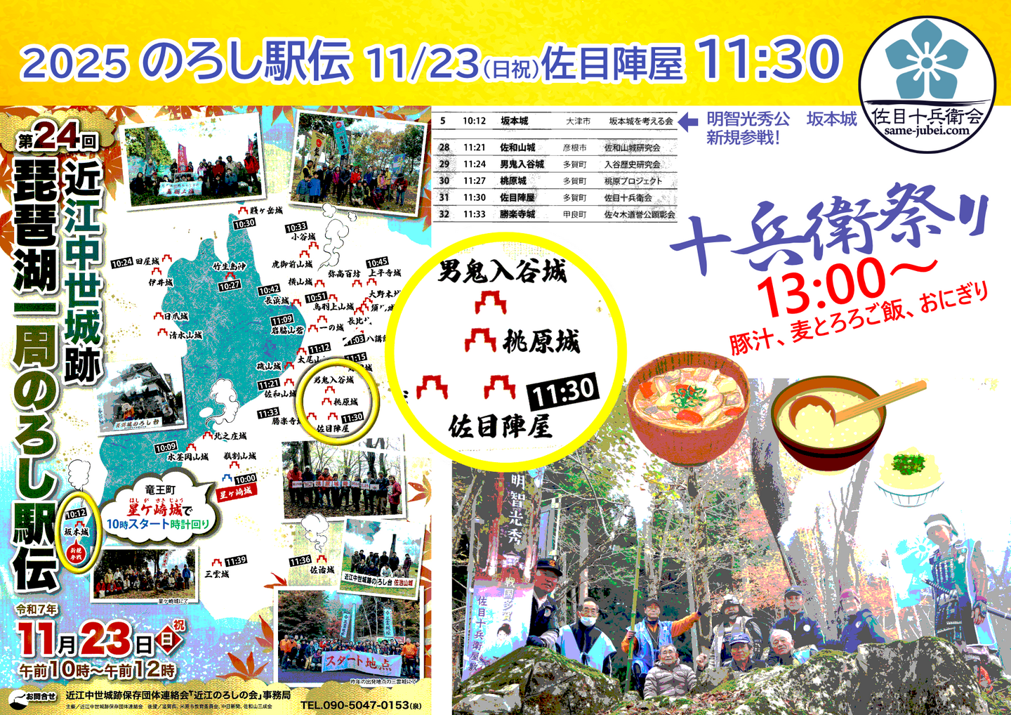 びわ湖ぐるっと一周のろし駅伝、24回目を迎える今年も多賀から『狼煙(のろし) 』を上げます!2025年11月23日(日・祝) 10:00、竜王町・星ヶ崎城よりスタート。びわ湖を時計回りに、多賀は 11:24 鬼男入谷城、11:27 桃原城、11:30 佐目陣屋と3分おきに狼煙が上がります。中世・戦国の近江がどのような雰囲気だったか想像しながら、湖東の山をご覧ください。そのあと13:00より十兵衛屋敷跡にて「十兵衛祭り」の開催です。お楽しみに!!