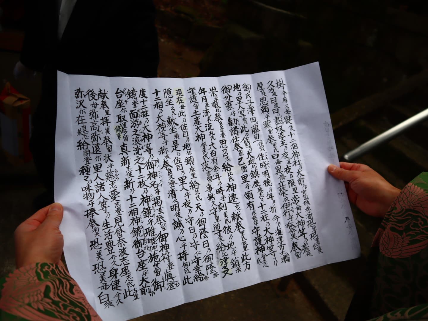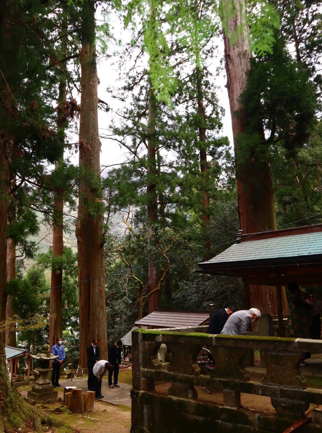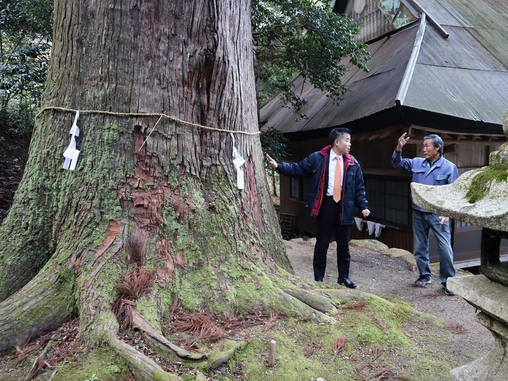 ・樹齢650年の御神木の杉の木と知事。つまり、多賀出身説が本当ならば、光秀もこの木を見て、この神社で遊んでいたはず。パワースポットと言われていますが、ぜひご自身で感じて下さいませ。