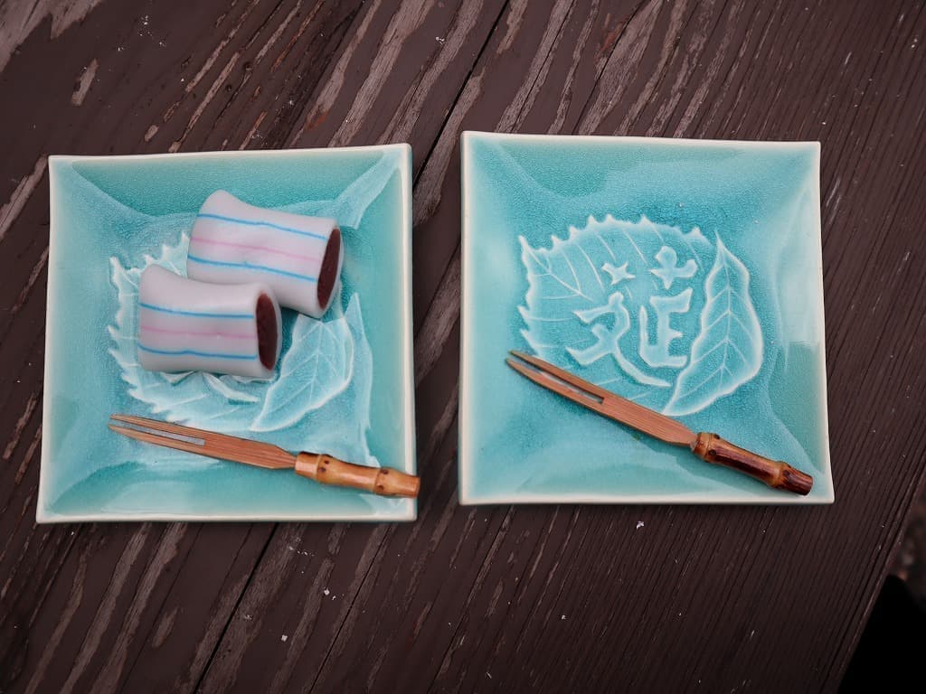・多賀名物「糸切り餅」を召し上がる知事。お皿は結婚記念に見津さんが多賀大社からもらったという「虫食い折れ柏の紋」、しかも光秀の水色のお皿。